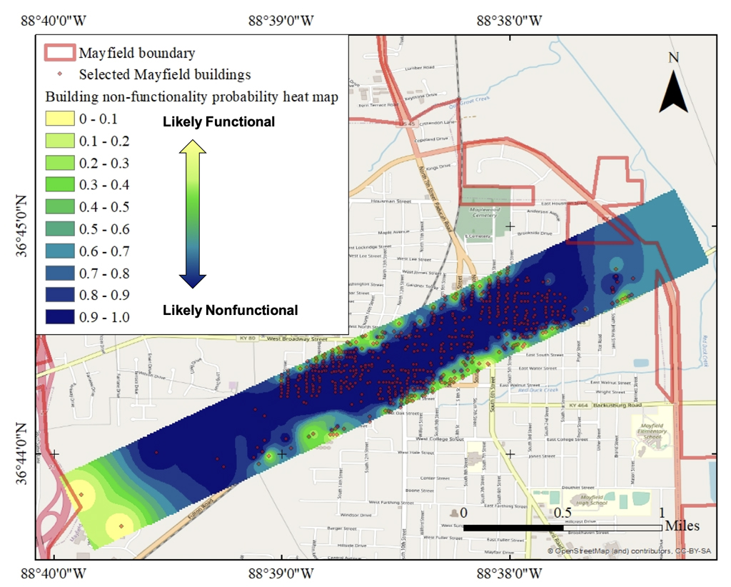 The CoE used IN- CORE’s modeling environment to hindcast the community-level building damage in Mayfield for residential buildings to explore how different building codes or policies could have decreased housing damage and decreased population dislocation.