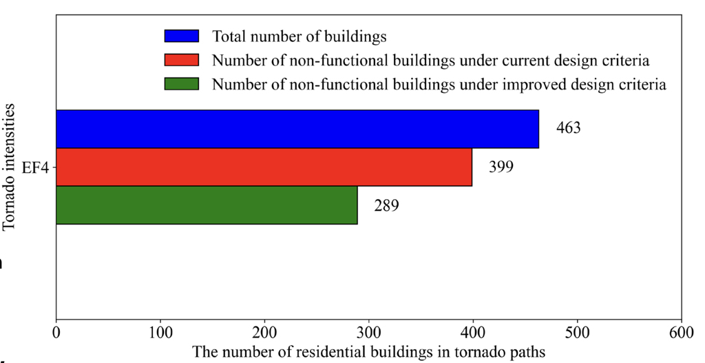 The graph below shows the total number of buildings in the path of the simulated EF4 tornado shown in figures 1 and 2, and the resulting number of buildings rendered nonfunctional under current design and under improved building designs.
